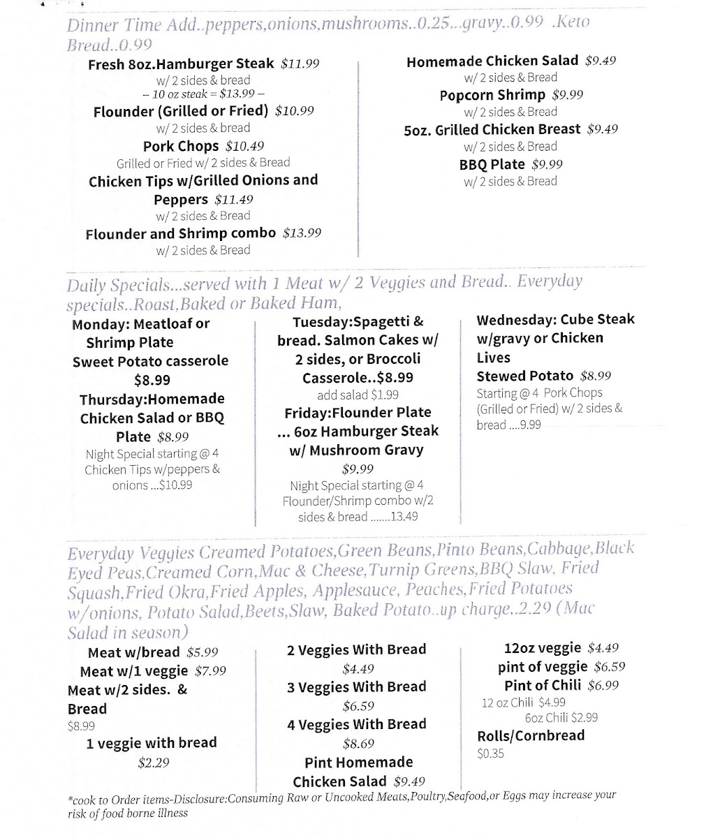 Breakfast favorites such as biscuits and gravy, perfectly cooked eggs to your liking, and the Cakes & Eggs with French toast platter provide a warm, satisfying start to the morning. Later in the day, the menu shifts smoothly to casual lunchtime and evening options like the 8 oz Big Bacon Cheeseburger, double cheeseburger paired with chili cheese fries, or the homestyle meatloaf, perfect for enjoying in a relaxed setting.