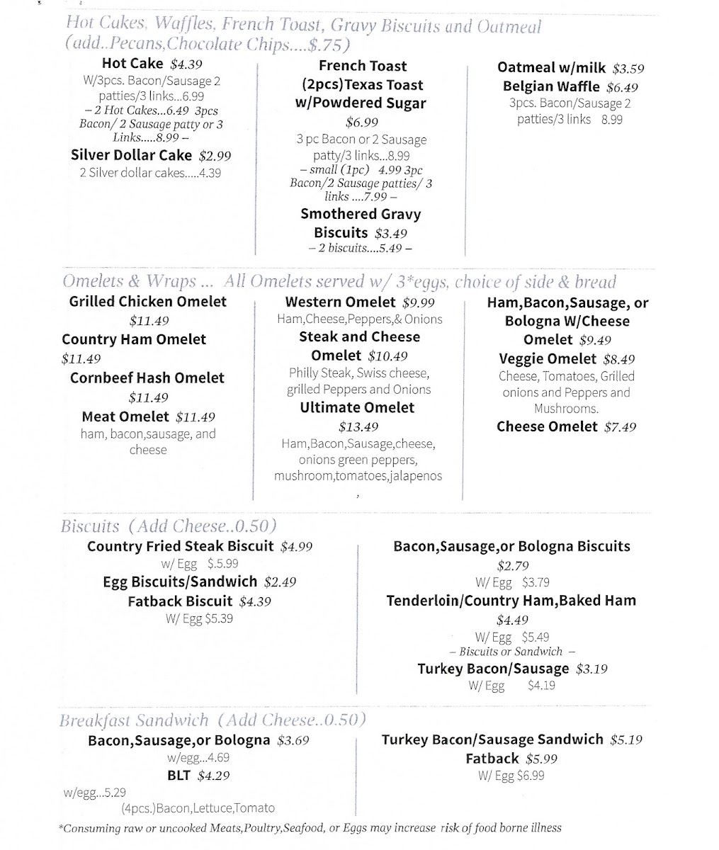 Church Street Station offers a straightforward, comforting menu that feels like a classic American café. The selection centers around familiar, hearty dishes served in generous portions, making it an ideal spot for starting the day or settling in for a casual meal at any time.